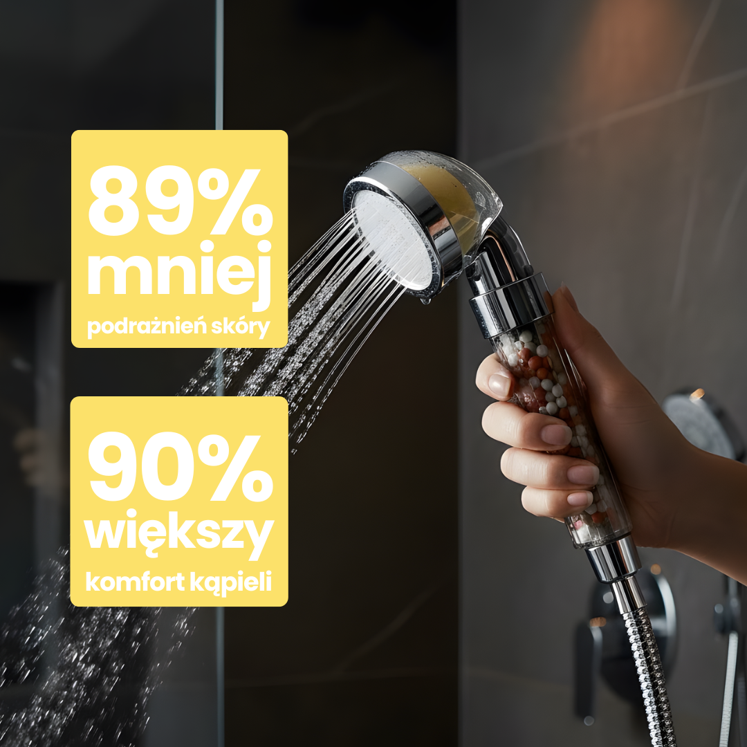 Filtr usuwa chlor, metale ciężkie i zanieczyszczenia, które podrażniają skórę i wysuszają włosy.